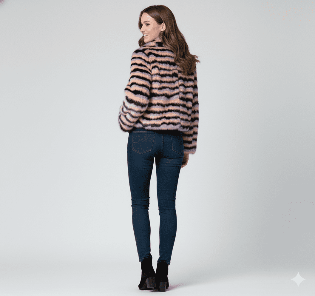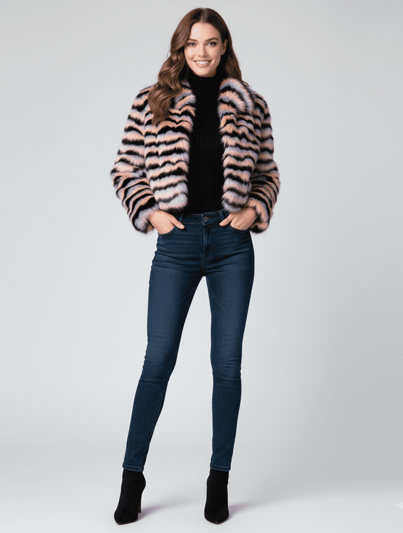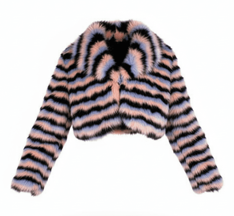 Alex Max AM1352 Faux Fur Short Jacket - From Florence, Italy Experience Italian Chic & Unmatched Softness Elevate your style with the stunning Alex Max AM1352 Faux Fur Short Jacket, a luxurious and playful piece hailing directly from the fashion-forward streets of Florence, Italy. Crafted from a premium "A" Class ecological faux fur, this jacket is incredibly soft and smooth to the touch, offering all the glamour of real fur with a conscience. Exquisite Design & Superior Comfort This beautiful short swing-style jacket features a captivating design of black and pink horizontal stripes, interspersed with delicate lilac tones, creating a visually striking and modern aesthetic. Its meticulous craftsmanship ensures a delicate yet durable finish, promising to be a cherished addition to your wardrobe. The comfortable 100% polyester lining makes it a joy to wear. Effortless Style & Versatile Wear The AM1352 jacket is designed for the contemporary woman who loves to make a statement. Its flattering short length and swing style make it an incredibly versatile piece, perfect for effortlessly adding a touch of glamour to any outfit. Product Details: Indulge in the luxurious feel and eye-catching design of the Alex Max AM1352 Faux Fur Short Jacket – your new go-to for adding warmth, style, and a touch of Italian flair to any occasion!