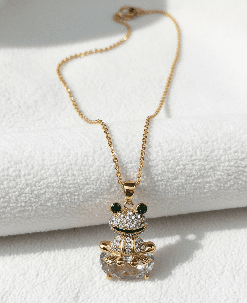 This frog with green eyes Chain length 40cm approx. Care Instructions: Avoid contact with liquids and perfumes. This exquisite designer jewellery arrives beautifully packaged in a pretty gift box worth more than £3