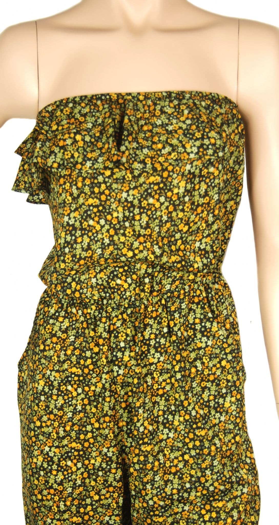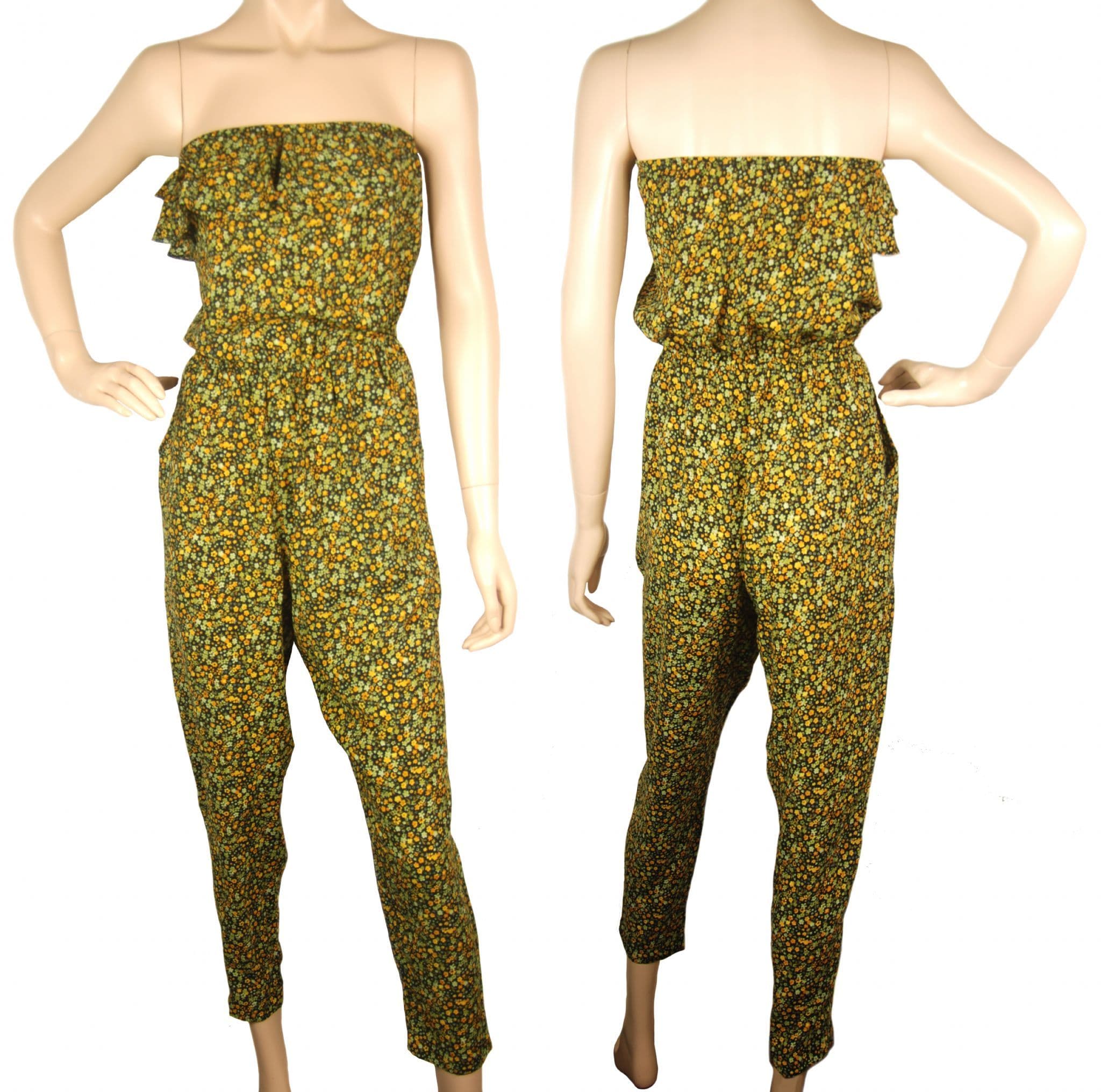 ConMiGo J215 off shoulder light yellow gold and light green floral print jumpsuit - S/M size This jumpsuit is for S/M Size fits UK size 8 to 12 Soft light fabric Light yellow gold and light green floral print bandeau top Elastic on waistband Bust length : 88cm (with elastic and able to stretch) Waist length : 58cm (with elastic and able to stretch) Jumpsuit length : 122cm Cotton & polyester
