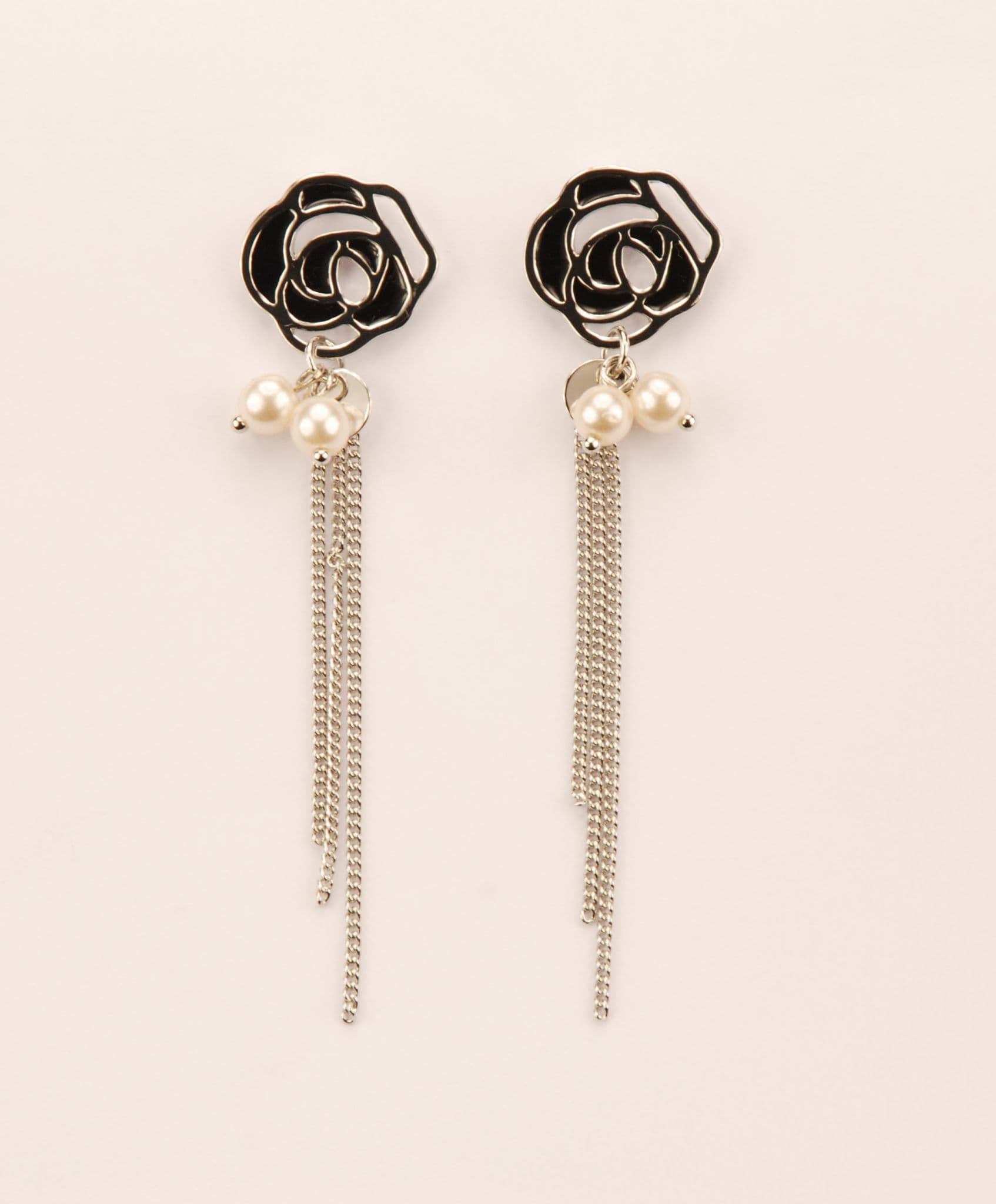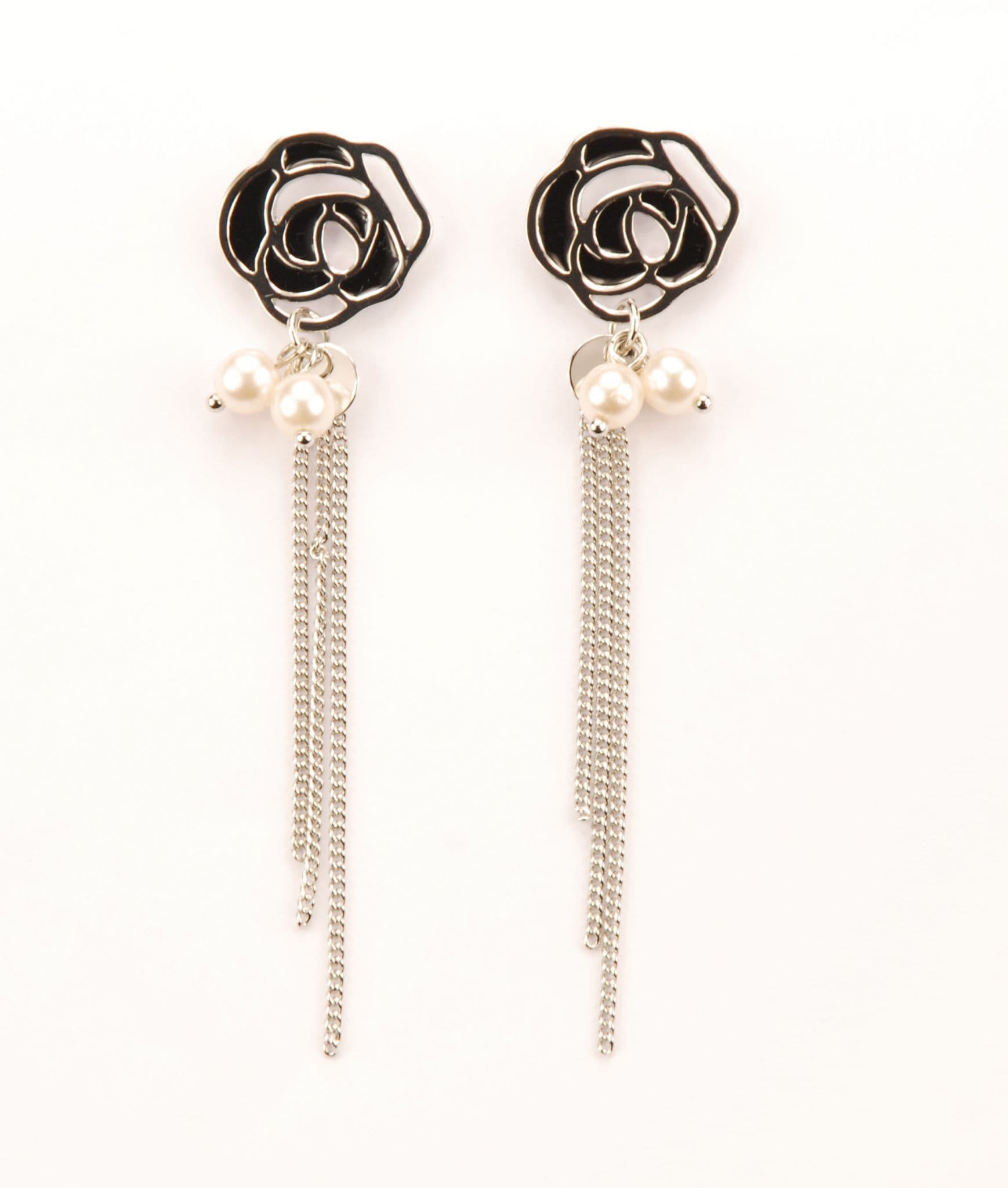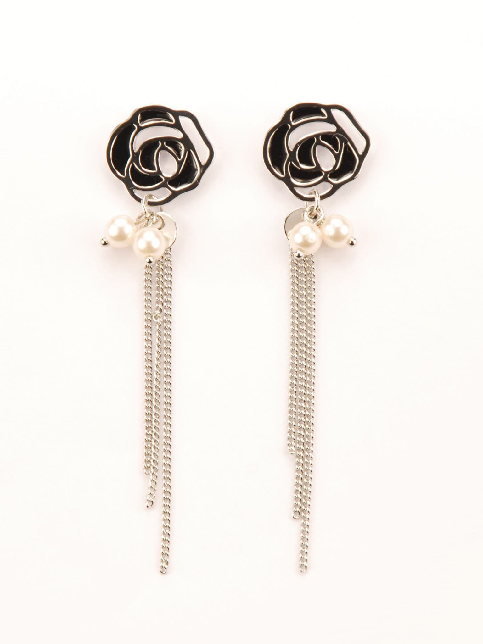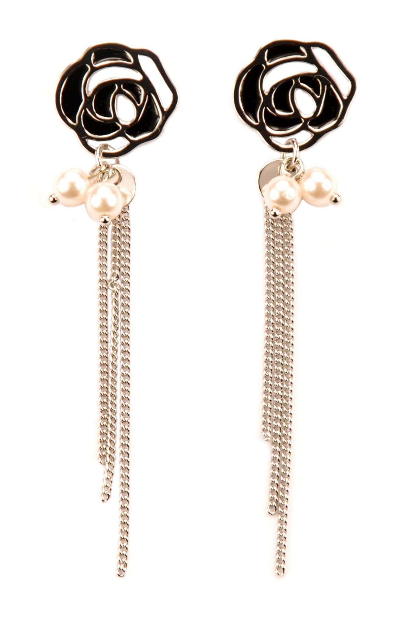 ConMiGo London E110220 Contrasting black, silver and pearl flower stud earrings Guide length 6cm approx. Please note –the colouring varies under differing lighting conditions