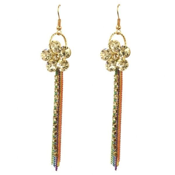 EA20130 - Sparkling silver flower crystal with a strings of gold, silver simmering crystal and multicolour metal drop earrings • For pierced ears with a 'gold' fish hook fastening • Approximate Earring Length: 11 cm • Care Instructions: Avoid contact with liquids and perfumes Please note –the colouring varies under differing lighting conditions