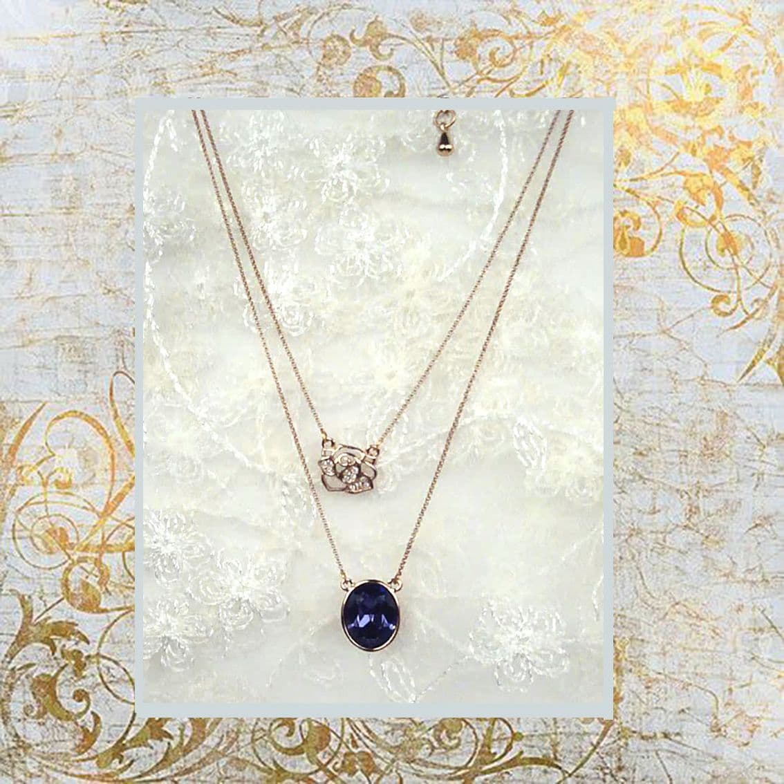 PA10160 rose gold chain with a shimmering embroidery rose and a blue crystal pendant