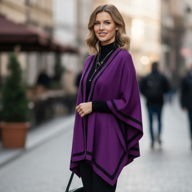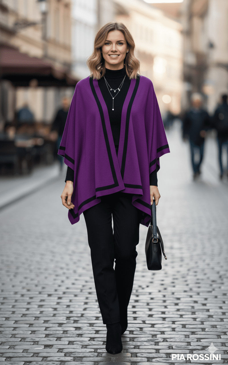 PIA ROSSSINI AVA WRAP - VIOLET/BLACK Description: Easy City Styling Wrap, Classic Wrap with Stripe Border Detail Fabric: 100% Acrylic Dimensions: 100X145CM